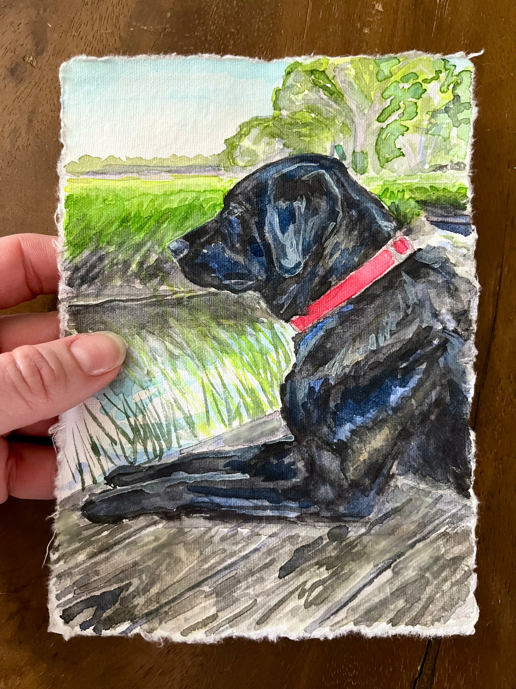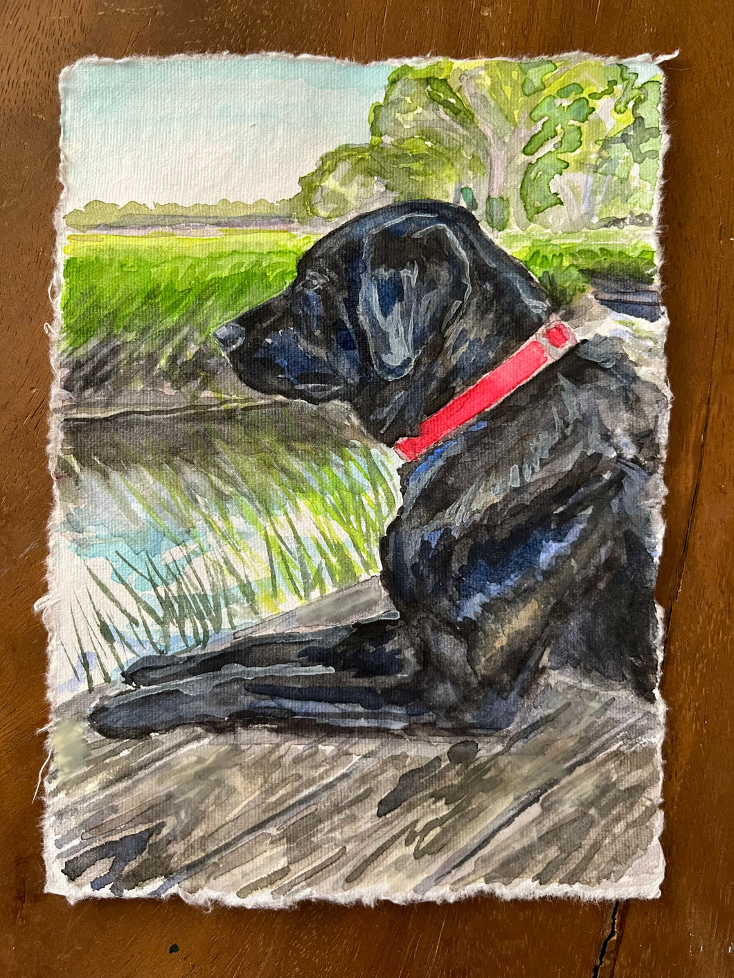 This painting is made with watercolor on heavy, hand pressed, deckled-edged watercolor paper.