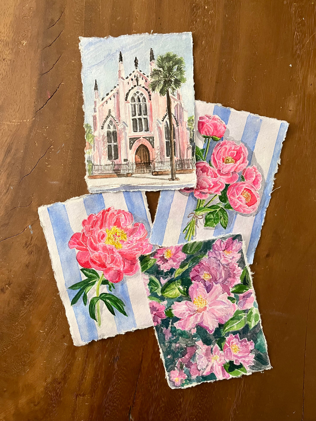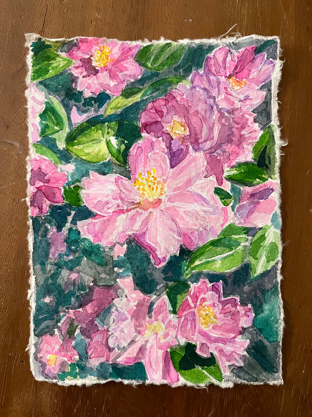 This painting is made with watercolor on heavy, hand pressed, deckled-edged watercolor paper.